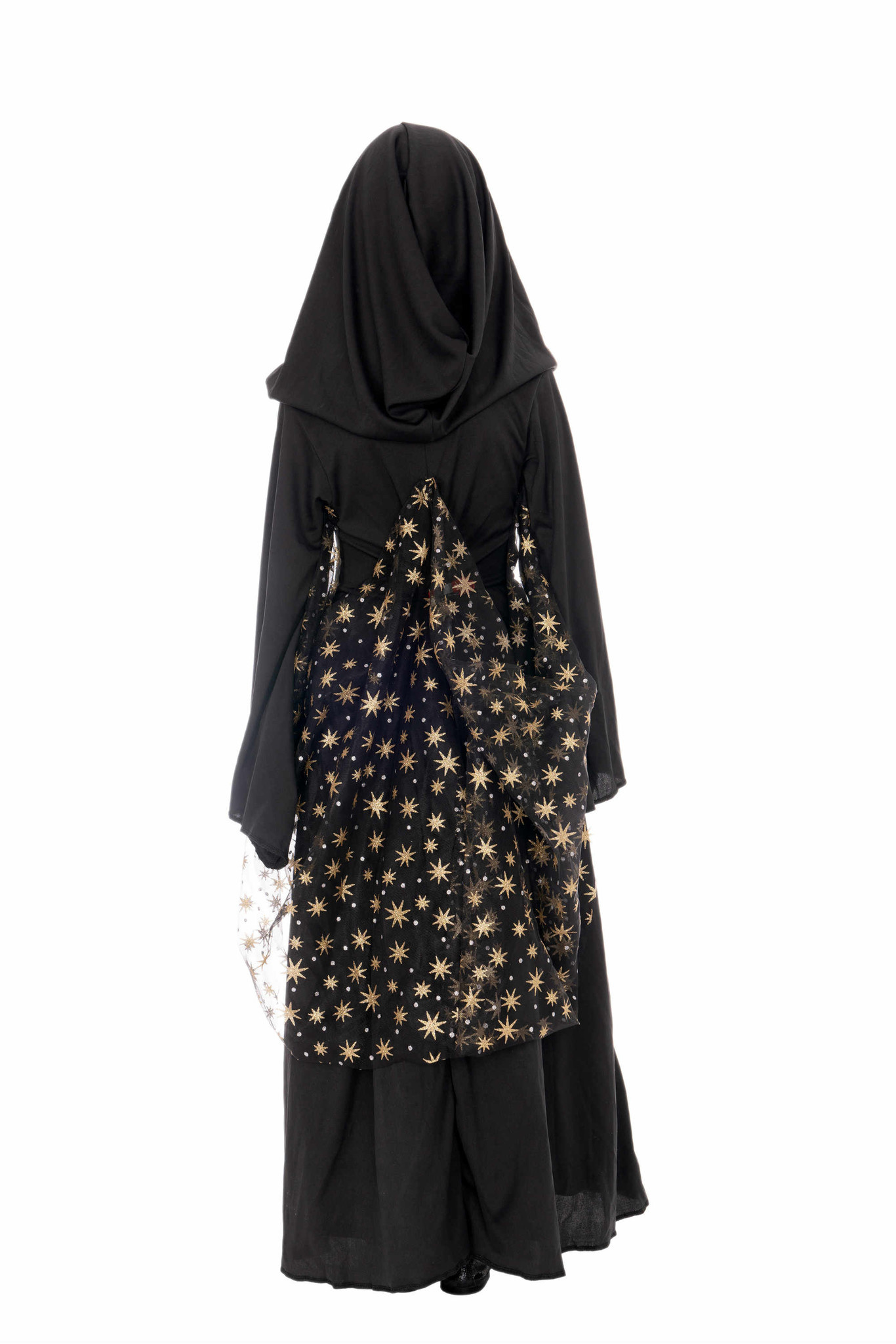 Een sprookje van de maan - Deze lange jurk in zwart, roze en goud ziet eruit als een lange cape met capuchon vanwege de contrasterende kleur. De rok van de jurk is bedrukt met maan en sterren. De rug en mouwen zijn bedekt in het zwart met gouden sterprints, die indien nodig kunnen worden verwijderd. Het kostuum kan worden gebruikt als een goochelaar of heks vermomming.