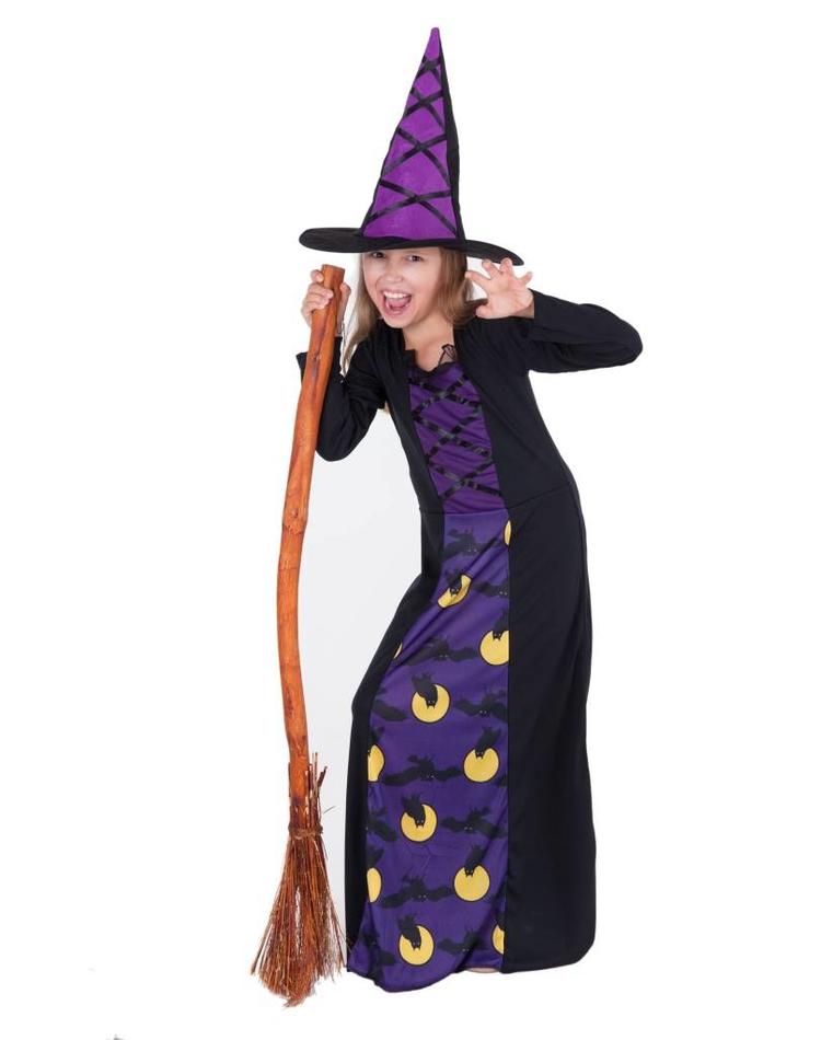 Heksenjurk Halloween voor meisjes. Deze heksenjurk wordt inclusief heksenhoed geleverd en heeft een motief met uilen in de manenschijn. De bezem wordt niet meegeleverd.