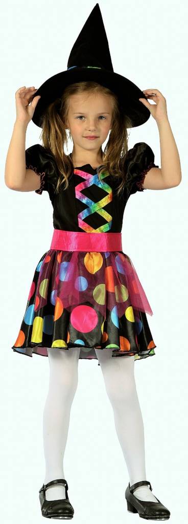 Korte heksenjurk voor meisjes. Deze heksenjurk bestaat uit een heksenjurk met polkadots, een riem en een hoed.