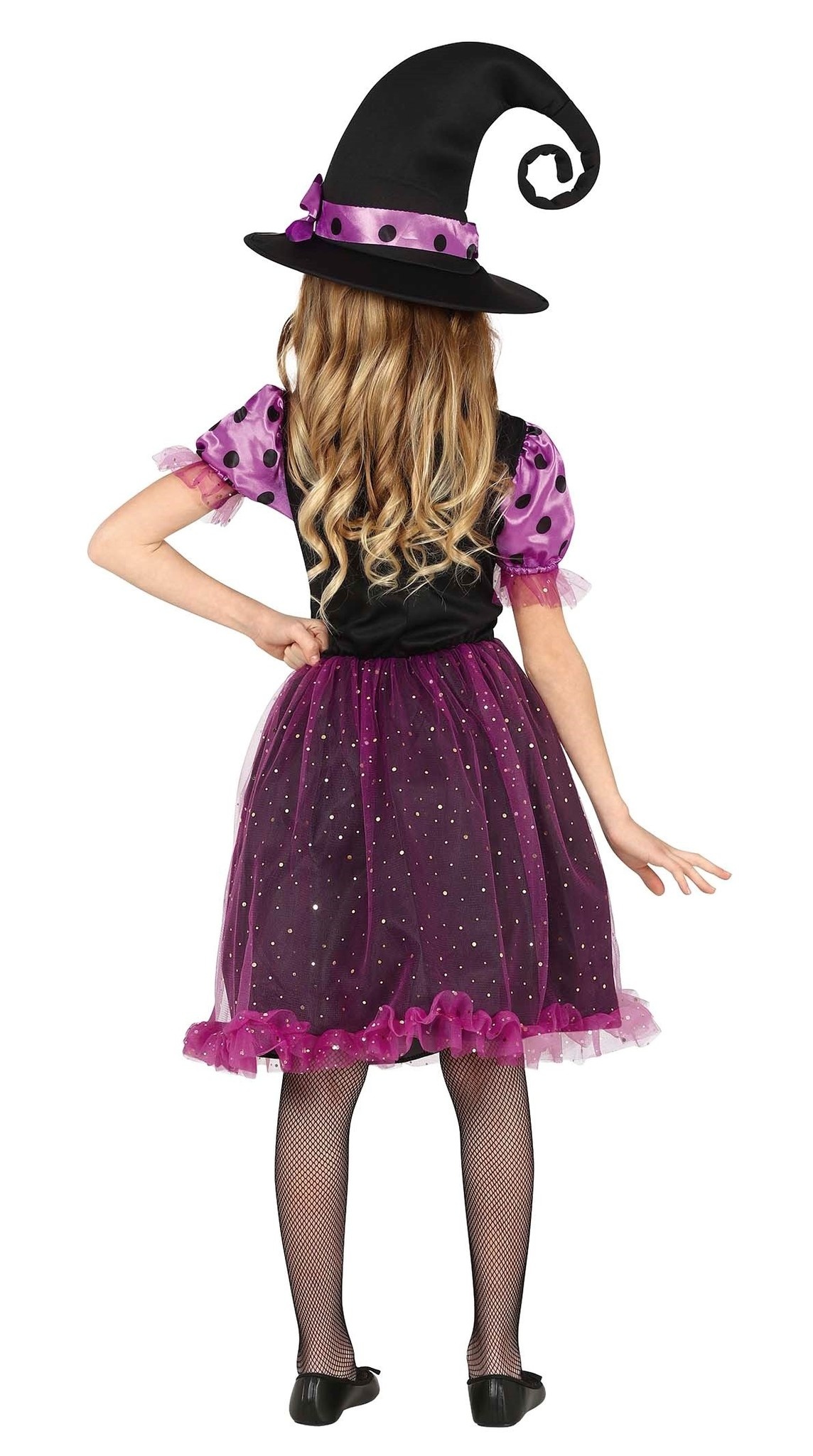 lila-zwart heksen kostuum voor meisjes., bestaande uit een heksenjurk en een heksenhoed.