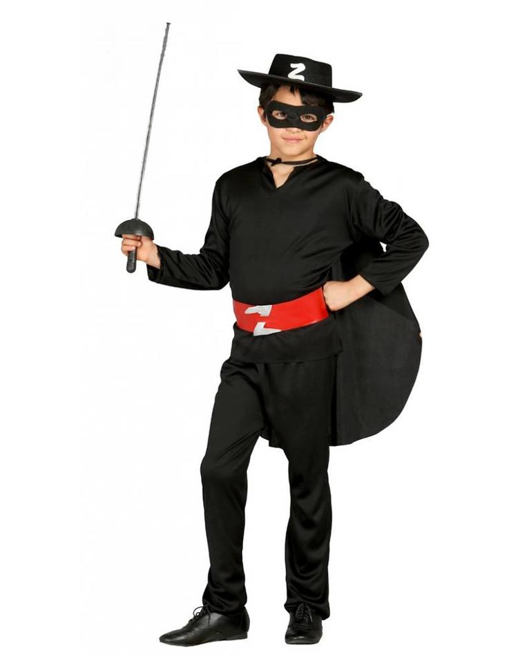 Zorro pak voor jongens verkrijgbaar in 3 verschillende maten. Dit Zorro pak voor kinderen is compleet en bestaat uit een zwarte broek, shirt en cape, een rode riem en een zwarte hoed met de letter Z erop. Dit complete Zorro kostuum wordt voor een zeer aantrekkelijke prijs verkocht. De Zorro zwaard is niet inbegrepen, maar die kunt u wel apart bij onze accessoires afdeling bestellen.