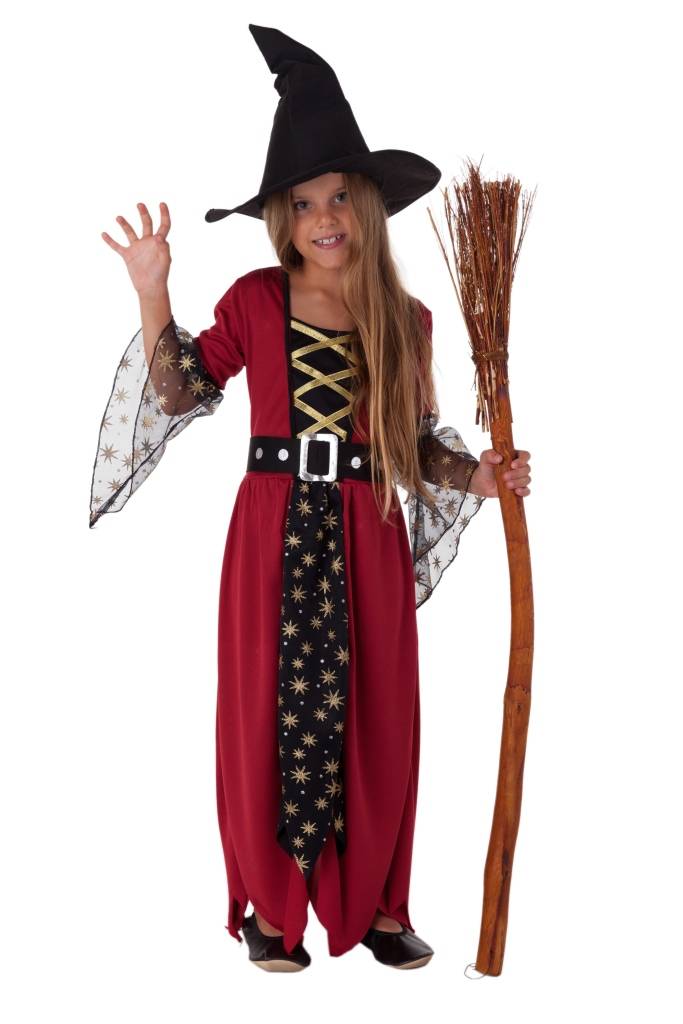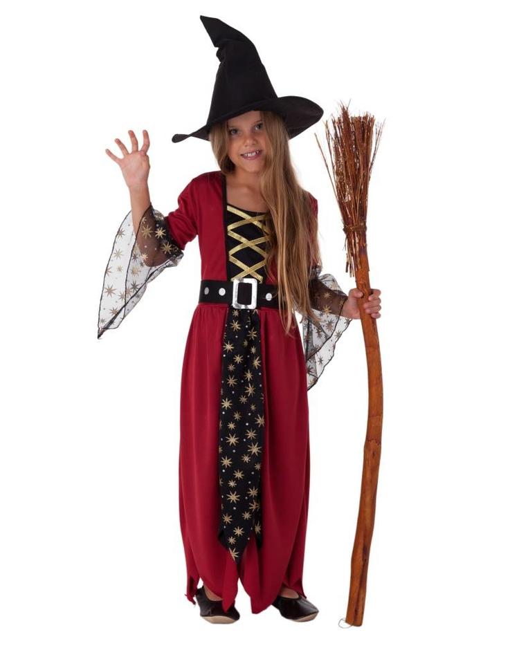 Dit rode heksenpak bestaat uit een lange heksenjurk en een heksenhoed. De bezem wordt niet meegeleverd.
