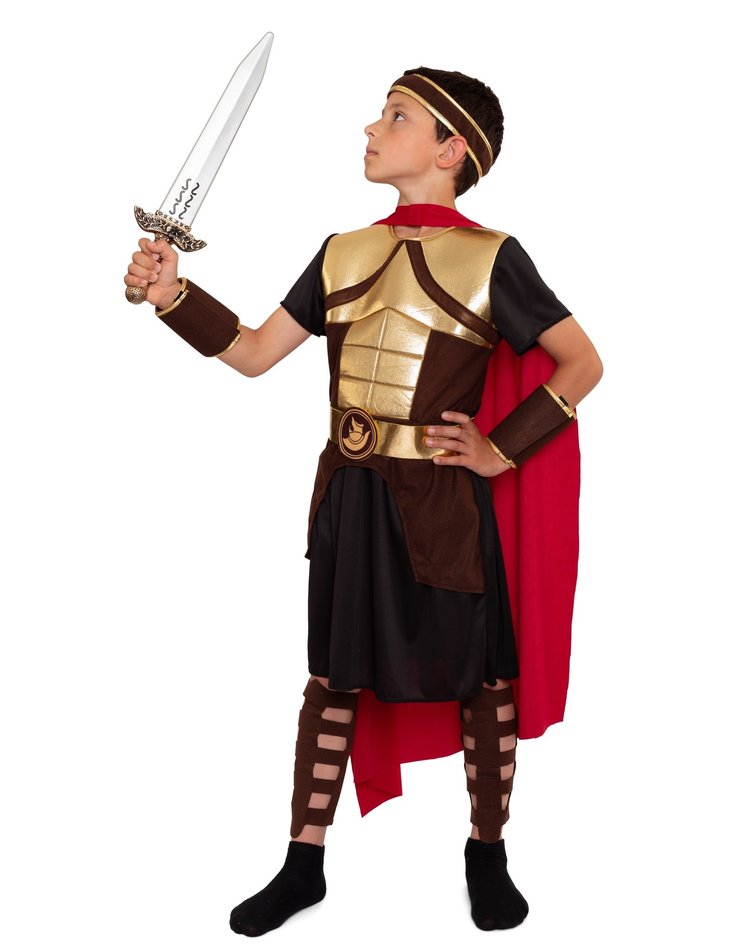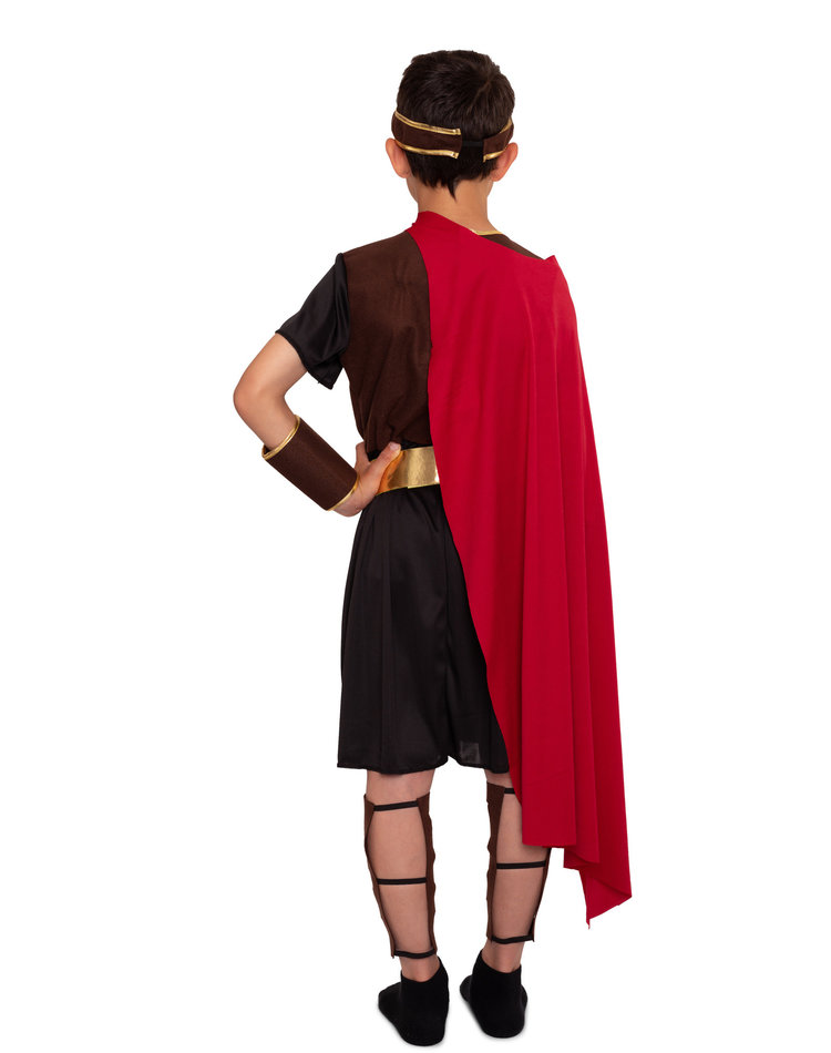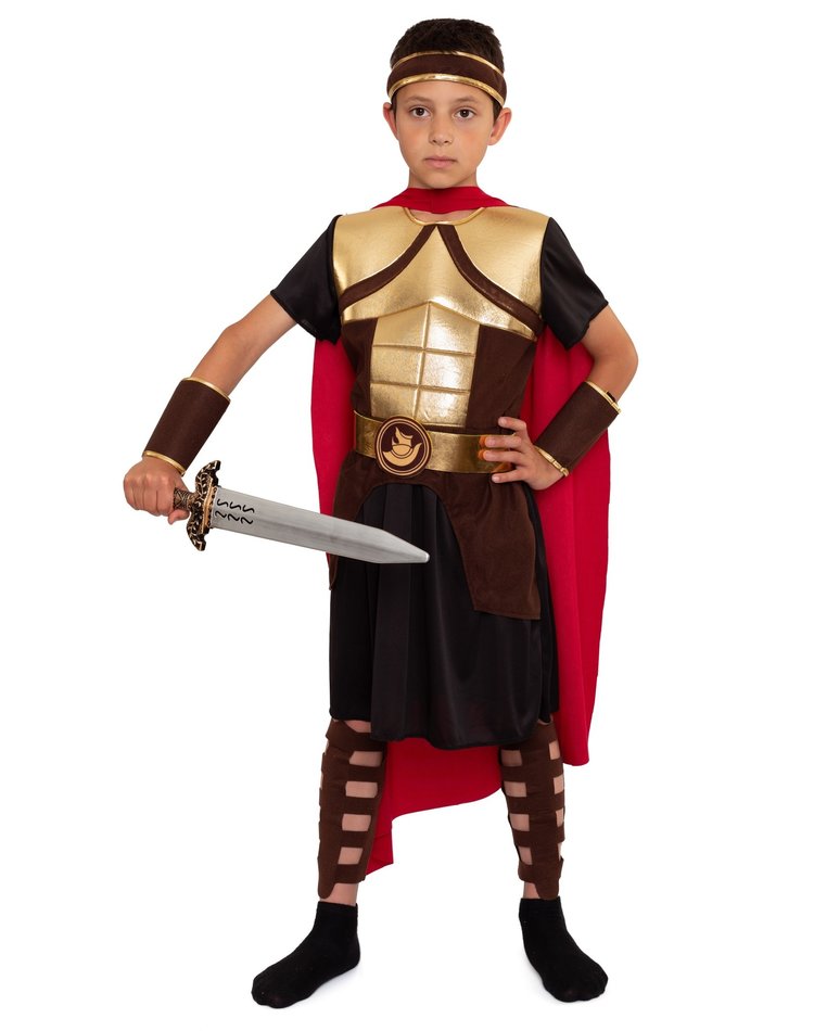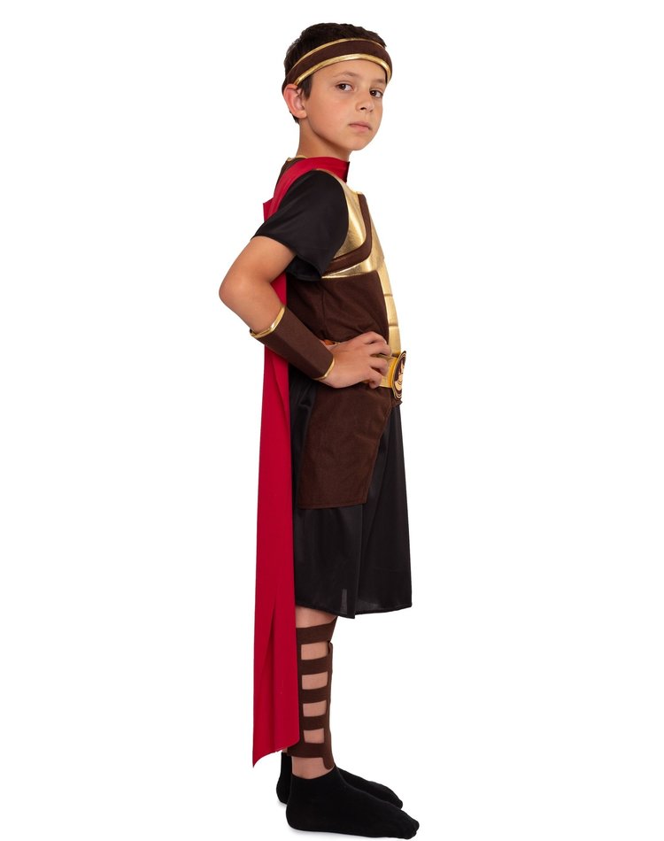 Romeins gladiator kostuum voor jongens. Dit gladiatorenpak is gemaakt in de kleuren goud, bruin en rood. het gladitor pak bevat een tunika, riem, beenstukken, armstukken, hoofdband en een cape. De schoenen en zwaard zijn niet inbegrepen.