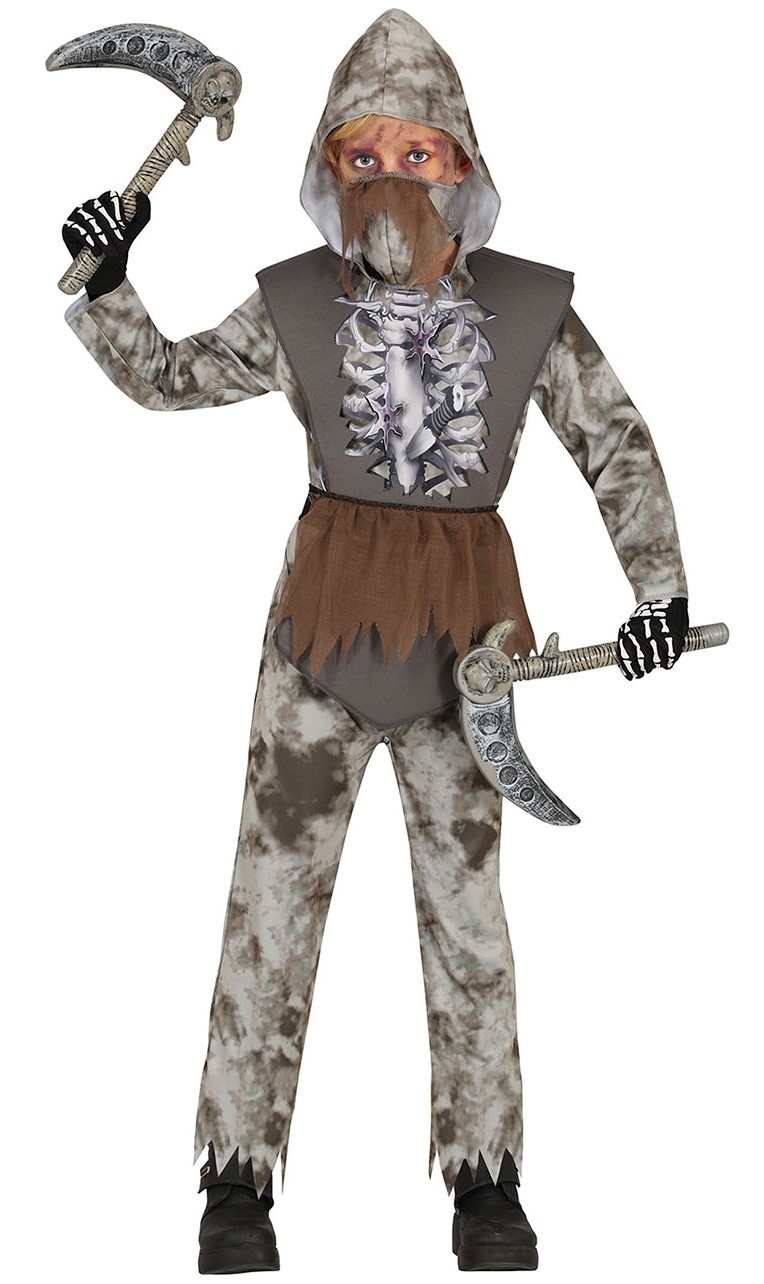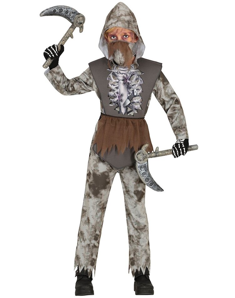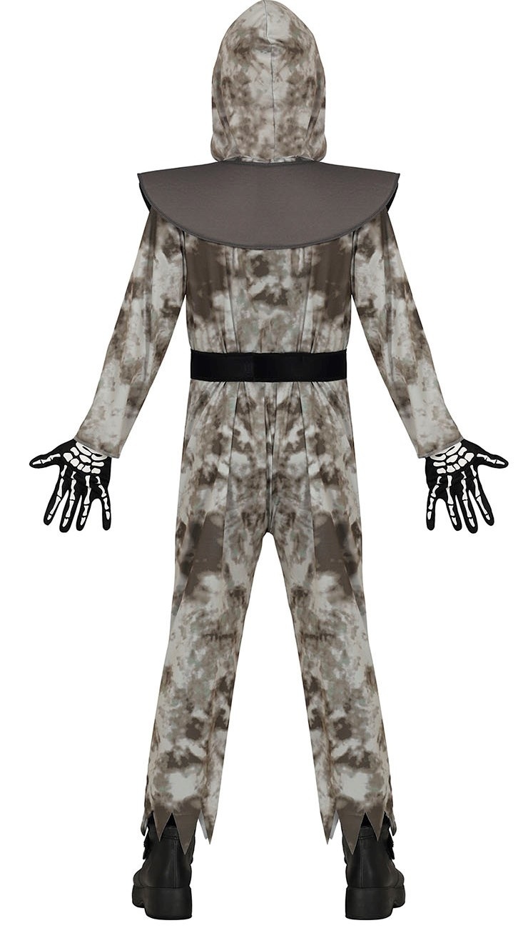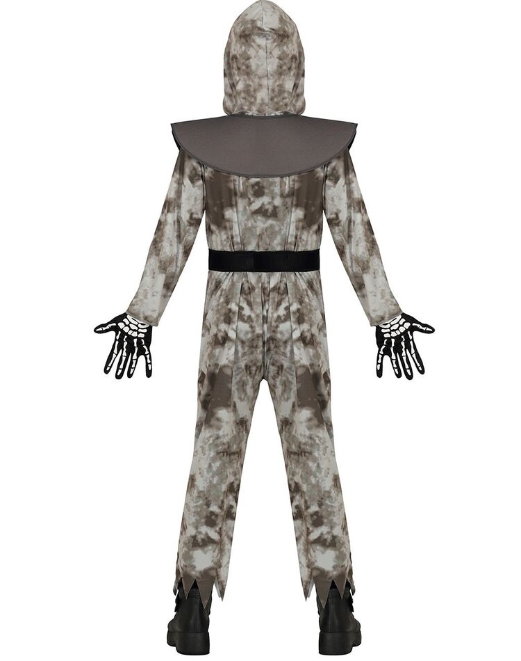 skelet ninja jumpsuit met capuchon, een harnas met riem en een masker